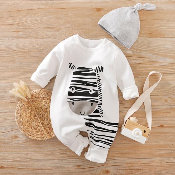 2-piece Zebra Printed Long Sleeve Jumpsuit with Hat Set for Baby