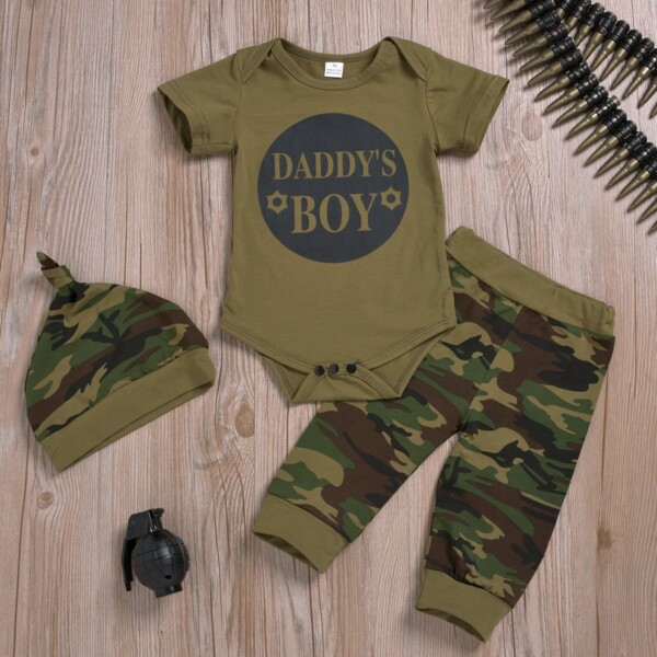 3-Piece Short-Sleeve Letter Print Bodysuit, Camouflage Pants and Hat
