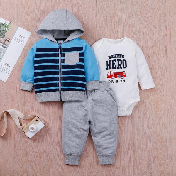 Buy Wholesale 3-piece Solid Bodysuit & Hooded Striped Coat & Pants for Baby Boy from China Wholesale, High-quality Baby Boy Sets affordable prices shipping world.