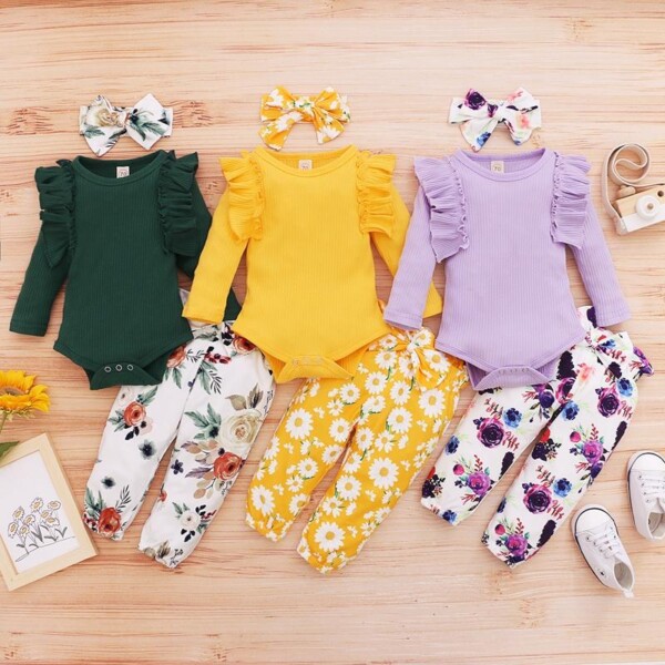 Buy Wholesale 3-piece Solid Ruffle Bodysuit & Floral Printed Shorts & Headband from China Wholesale, High-quality Baby Girl Jumpsuit affordable prices shipping world.