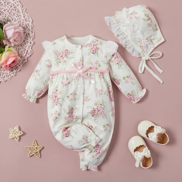 Baby Floral Print 100 Day Party Jumpsuit with Hat