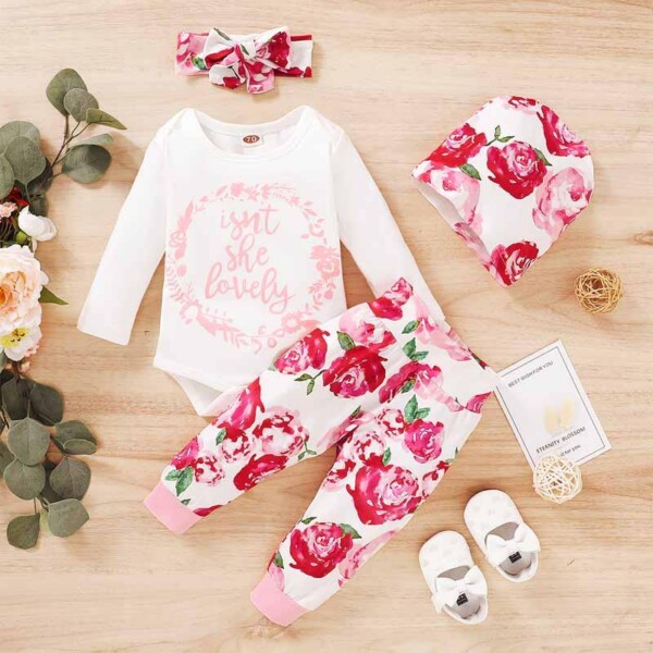 4-piece Letter Pattern Bodysuit & Floral Printed Pants & Headband & Hat for Baby Girl