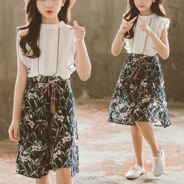 2-piece Ruffle Sleeveless Shirt & Floral Knee Length Pants for Girl