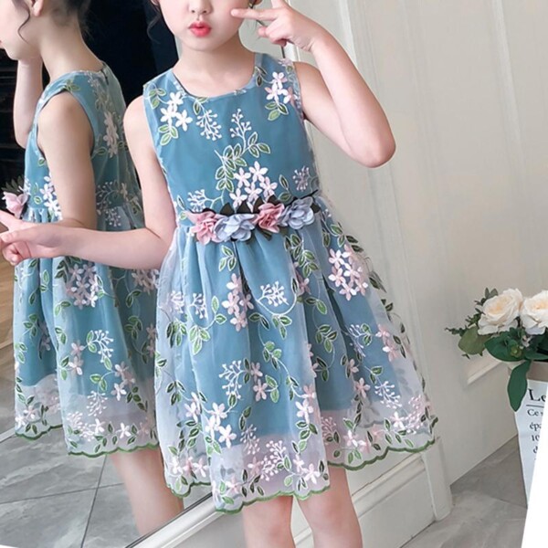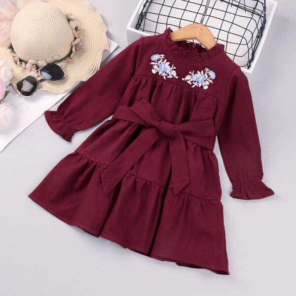 Embroidery Flowers Dress & Waistband for Toddler Girl