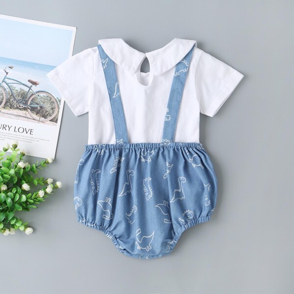 Baby Girls Lapel Short Sleeve Short Strap Shorts Two-piece Set (dinosaur pattern style)