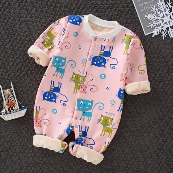 Fleece-lined Cat Pattern Jumpsuit for Baby