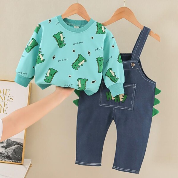 2-piece Dinosaur Printed Sweatshirts & Denim Dungarees for Toddler Boy