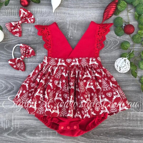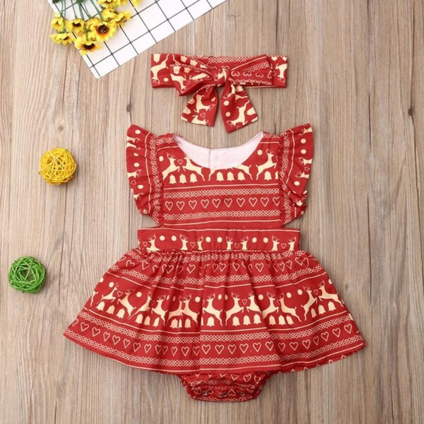 2-piece Christmas Deer Pattern Dress & Headband for Baby Girl
